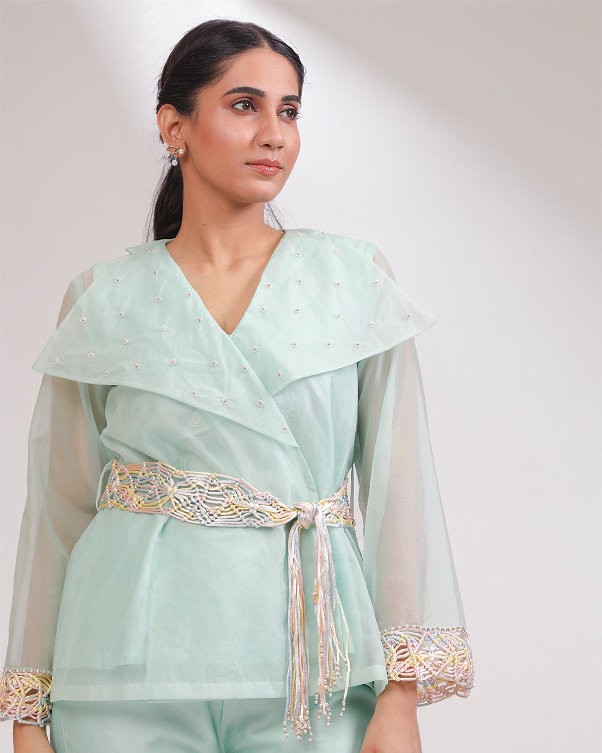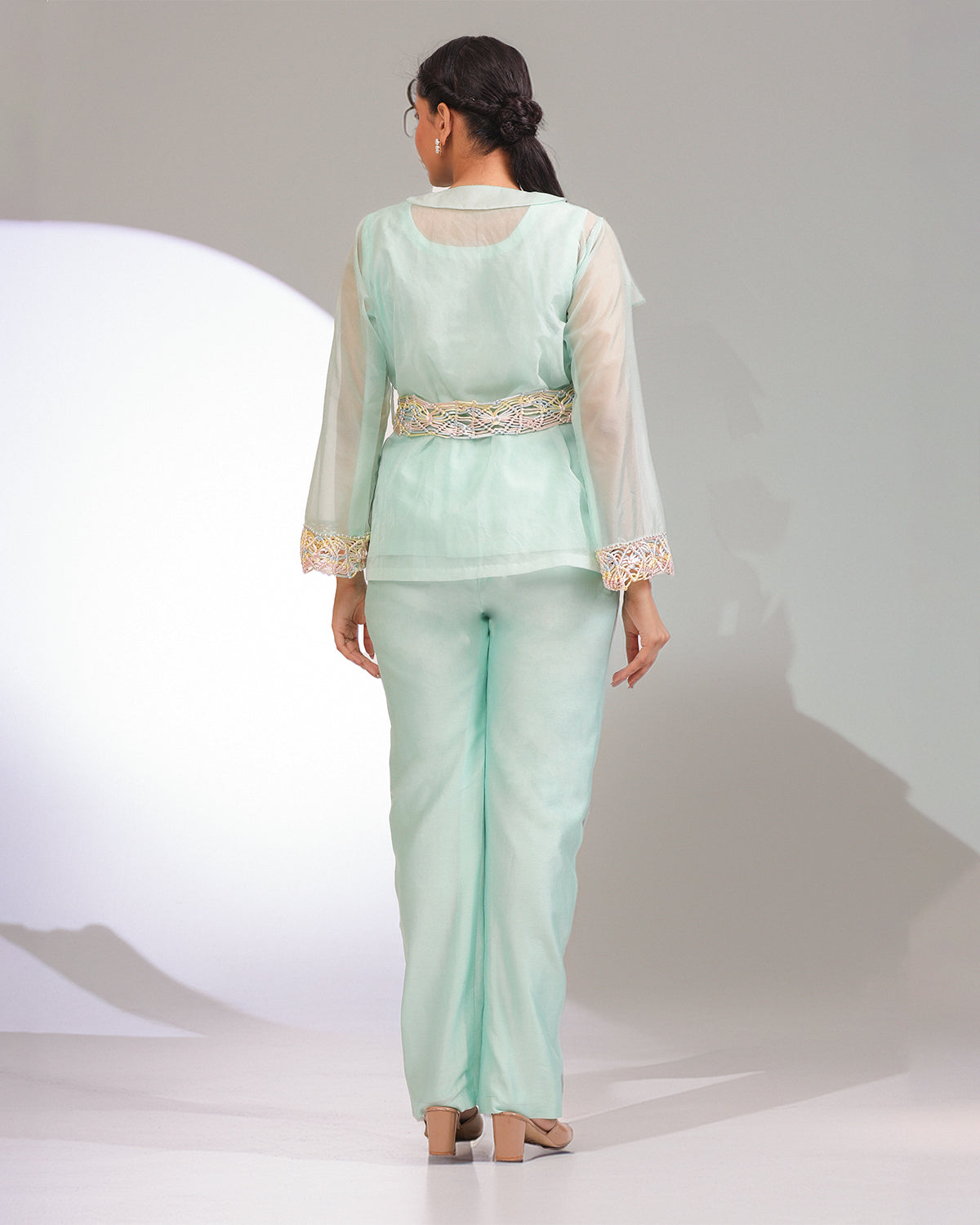 An organza jacket set in a mint hue paired with silk inner top and pants. Paired with Macrame belt and sleeves detailing. 3 Piece Set.