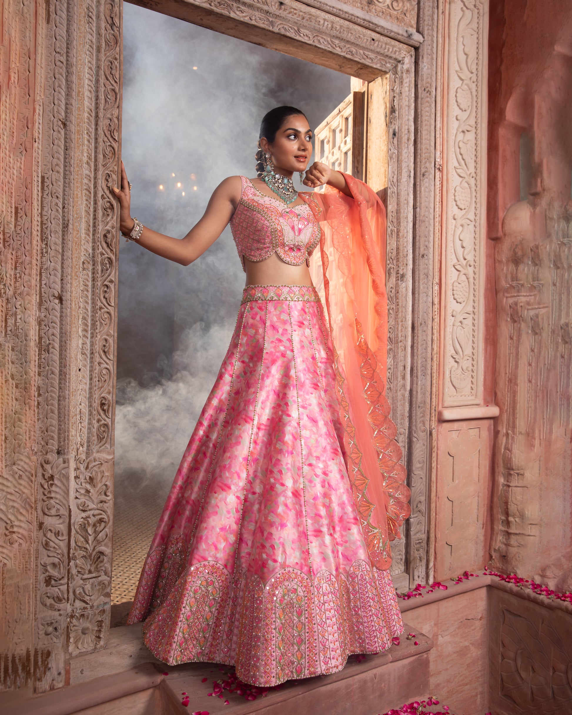 A captivating digital printed lehenga with hues of pinks and peaches, with spiral shaped cutwork embroidered border and is adorned with intricate beads, stones, shimmering pearls and coloured sequins. The ensemble is complemented by a matching embroidered beadwork blouse and a cutwork embroidered dupatta creating a vibrant and luxurious look.