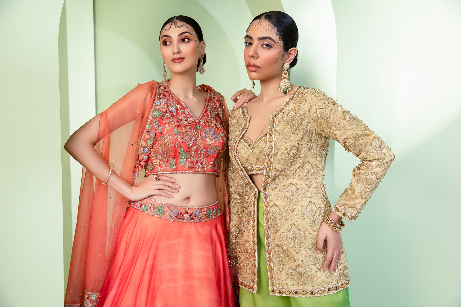 An Organza lehenga paired with a fully embroidered multi-hued blouse and a cutwork edged organza cape. All in a lovely coral shade!
