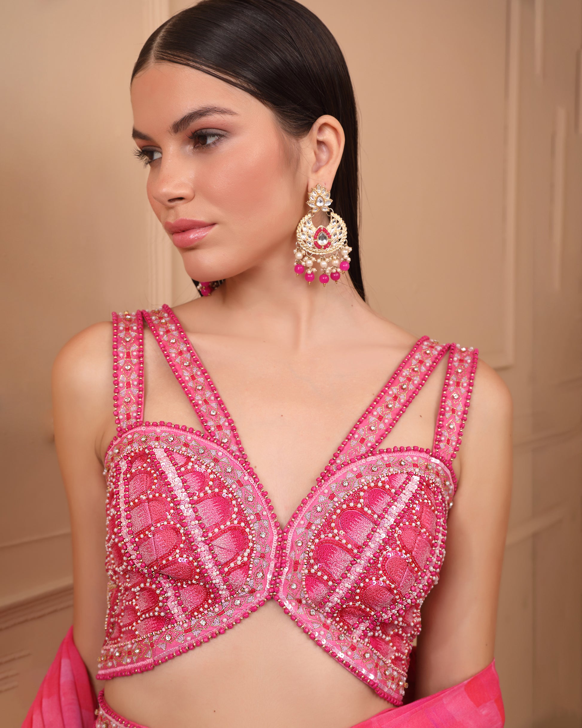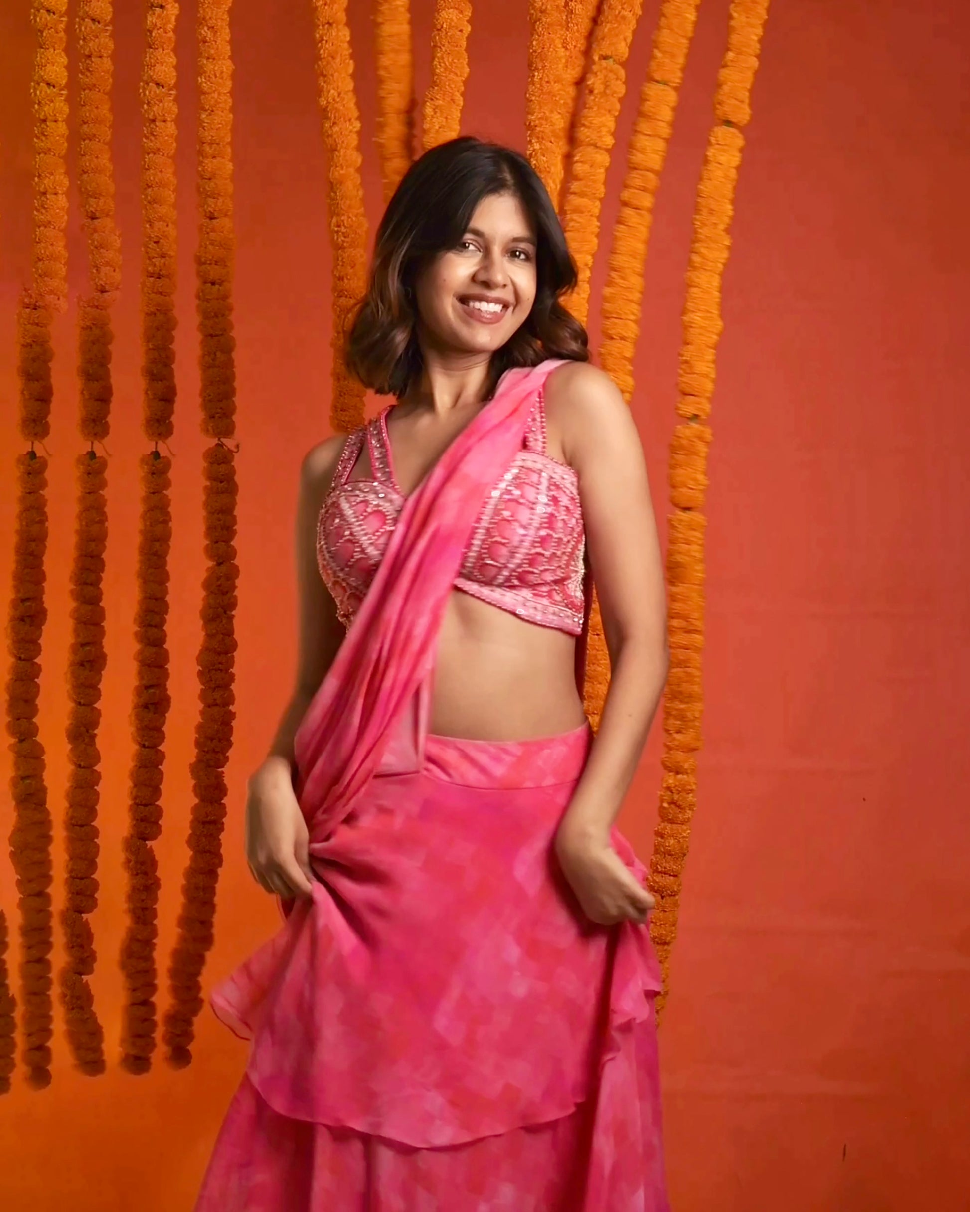 Featuring a digitally printed pink georgette base pre-stitched saree with ruffles cascading in layers that adds a modern touch to a traditional silhouette. Accompanying this is a threadwork embroidered silk dupion blouse, crafted with silk threads to create a stunning ombre effect in shades of pink and is further enhanced with meticulous handwork of beads, pearls and sequins. It has been paired with a separate embroidered belt.