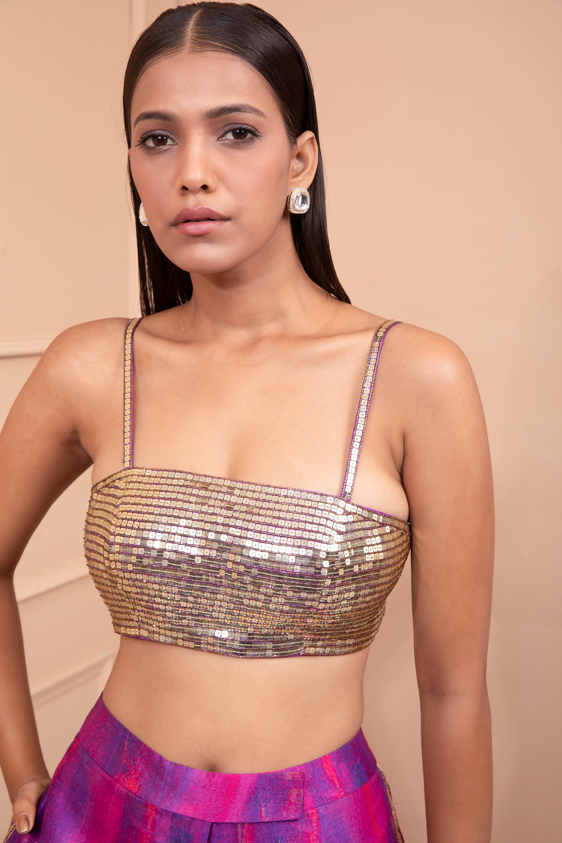 A digitally printed pant suit in hues of purple and magenta and has been crafted from luxurious silk dupion fabric. Accompanying the suit is a fully embroidered metallic bustier creating a classy shimmer look. The pant is designed in a flared style. The side seam of the pant and the blazer has been adorned with gold sequinned embroidery.